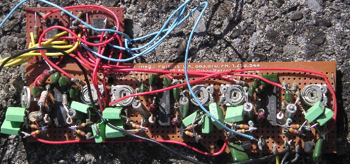 H. Hogg had taught me, that it is possible to get a nice distorted guitar sound with transistors and a linear amplifier system by boosting middle before and cutting treble after the distortion. I never had a guitar amplifier as any guitar player has. With the first money I earned soldering H. Hoggs huge mixing desks in '74, I bought effect modules from him, and built them into a handy amplifier with the following modules.