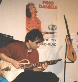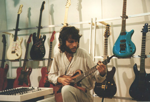 Matthias demonstrating AVALON at the booth in Frankfurt, '91. on the right a marvelous 12 string which is lost and then the blue Elegy which is Matthias main FireWire guitar since 2005. In the mean time it was sleeping :-). Also visible the mixing desk that Matthias made for the band Lizard in 1978 and later got piezo and polyphonic inputs. |