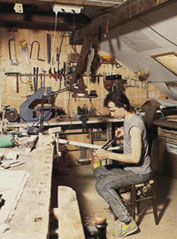 Rolf in his workshop, under the roof of an old farm house. Manufacturing happened with a considereable machine park in a separate building, with great help of lutier Jon Piguet.
